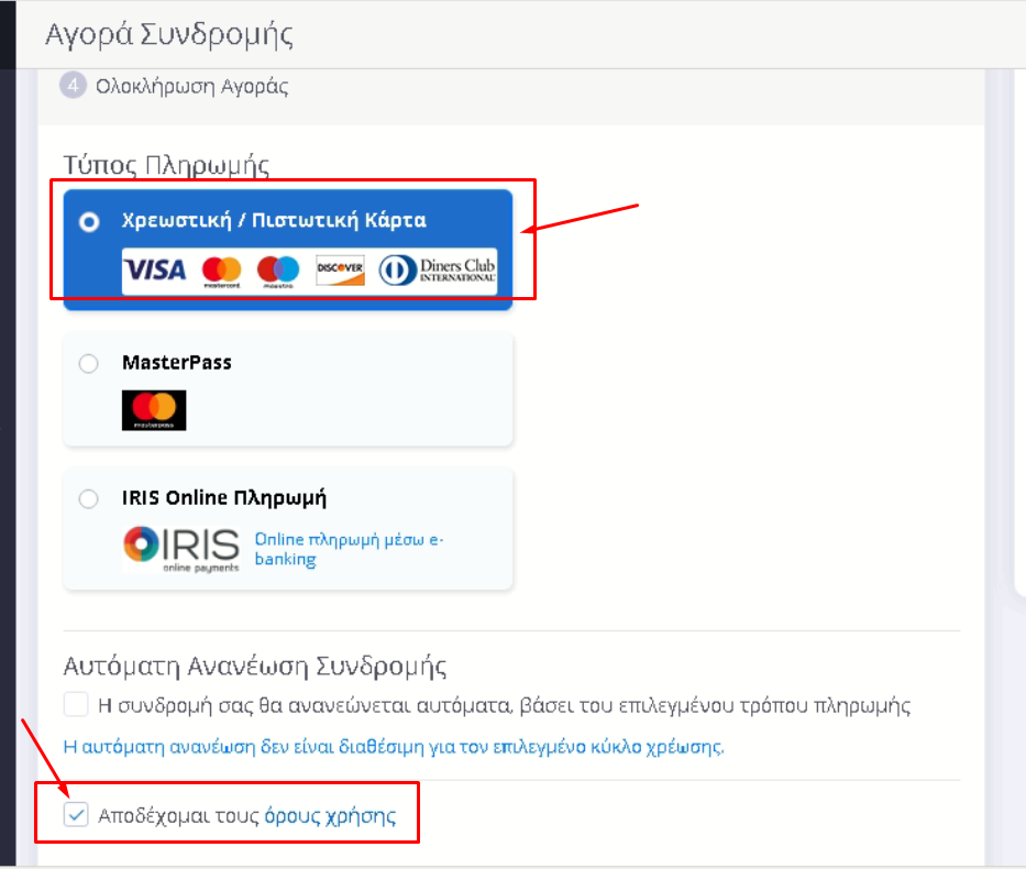 Στο επόμενο βήμα επιλέγεται τον τρόπο πληρωμής που θέλετε, προτείνουμε με Χρεωστική κάρτα. Τσεκάρετε και το Αποδέχομαι τους όρους χρήσης και πατάτε Ολοκλήρωση