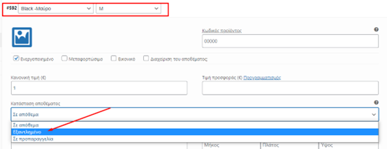 Έστω ότι έχω μια μπλούζα η οποία έχει SMALL,MEDIUM,LARGE και χρώματα μπλε και μαύρο. Θέλω να ενημερώσω το απόθεμα μου ότι το Μαύρο Medium έχει τελειώσει. Θα πάω στον συνδυασμό Μαύρο Medium και θα αλλάξω την κατάσταση αποθέματος σε Εξαντλήθηκε. Έτσι, το προϊόν θα υπάρχει σε όλους τους συνδυασμούς εκτός από το Μαύρο Medium.