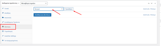 Στην συνέχεια πηγαίνουμε στην καρτέλα ιδιότητες και επιλέγουμε τις ιδιότητες που θέλουμε να έχει το προϊόν μας. Πχ επιλέγω χρώμα, πατάω προσθήκη. Αν έχει και μεγέθη, επιλέγω μέγεθος και πατάω προσθήκη.