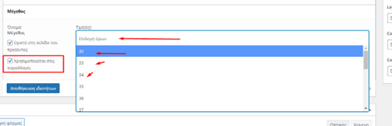 Πχ έχω πατήσει να προσθέσω μεγέθη. Στο πεδίο τιμές έχω 2 επιλογές που μπορώ να βάλω τα μεγέθη. Ή θα πατήσω το κουμπί επιλογή όλων έτσι ώστε να μου φέρει όλα τα μεγέθη που υπάρχουν και εγώ να επιλέξω ποια θα κρατήσω ή να τα προθέτω ένα ένα. ΠΡΟΣΟΧΗ. Εδώ υπάρχουν μεγέθη που έχω προσθέσει ήδη στο κατάστημα μου τουλάχιστον 1 φορά. Κάνοντας κλικ επάνω στο επιλογή όρων θα μου τα εμφανίσει και μπορώ να ξεκινήσω να τα επιλέγω. Στο παρακάτω παράδειγμα όπως βλέπουμε υπάρχουν ήδη σαν μεγέθη τα 32,33,34 κλπ. Τα επιλέγω και τα προσθέτω στο προϊόν μου.