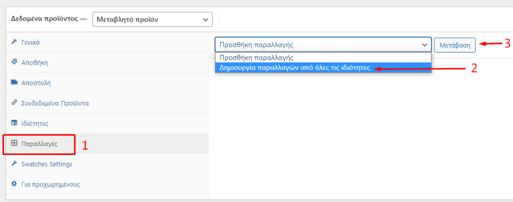Στην συνέχεια πηγαίνουμε στην καρτέλα Παραλλαγές και επιλέγουμε Δημιουργία Παραλλαγών από όλες τις ιδιότητες και πατάμε το κουμπί Μετάβαση.