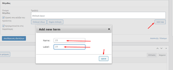Αν θέλουμε να προσθέσουμε άλλα μεγέθη πχ το 77, πρέπει να πατήσουμε «Προσθήκη νέας» ή Add New) όπως φαίνεται παρακάτω: