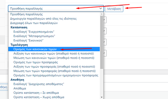 Αν για όλους τους συνδυασμούς μας έχουμε την ίδια τιμή τότε μπορούμε εύκολα να ορίσουμε τιμή για όλους τους συνδυασμούς. Πατάμε στο μενού που γράφει Προσθήκη παραλλαγής, επιλέγουμε το Ορισμός των κανονικών τιμών και πατάμε το κουμπί Μετάβαση.