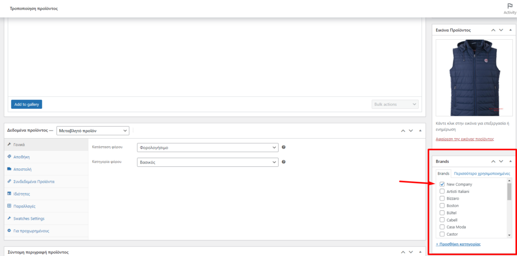 Στην δεξιά στήλη κάτω από την εικόνα του προϊόντος επιλέγουμε το brand του είδους από τα ήδη υπάρχων
