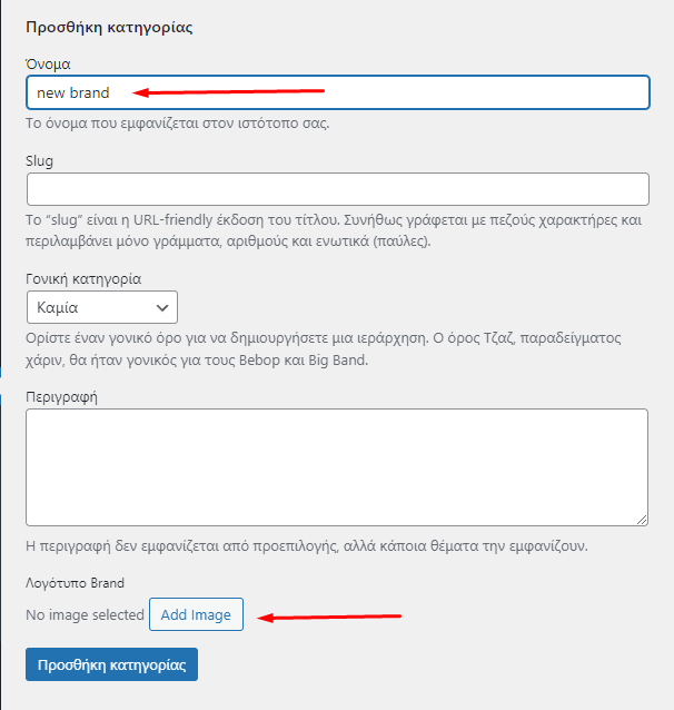 Στην συνέχεια εισάγουμε το όνομα του brand στο πεδίο Όνομα, το slug το αφήνουμε κενό και στην συνέχεια πατάμε στο κουμπί <<Add Image>> για να προσθέσουμε το λογότυπο του brand.