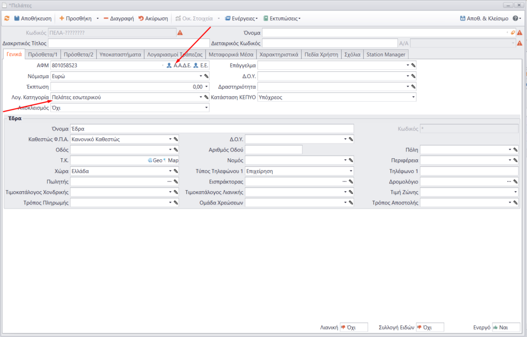 Εισάγουμε το ΑΦΜ του πελάτη και πατάμε το κουμπί Α.Α.Δ.Ε.