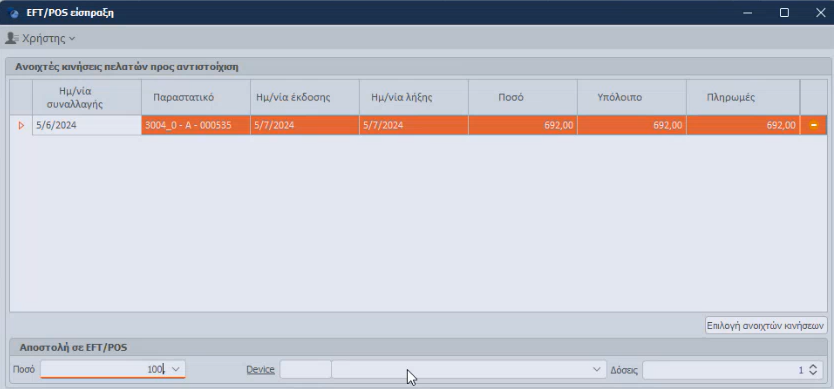 Επιλέξτε το παραστατικό προς εξόφληση και συμπληρώστε στο τμήμα της οθόνης “Αποστολή σε EFT/POS” :
