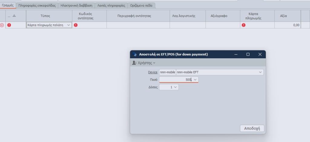 Πατώντας το κουμπί Αποδοχή η συναλλαγή αποστέλεται στο τερματικό POS. ΣΗΜΑΝΤΙΚΟ: Αν το τερματικό είναι μέσω middleware, πριν το πατήσουμε αποδοχή πρέπει να έχουμε πατήσει το κουμπί επικοινωνίας του POS με το middleware (συνήθως κίτρινο κουμπί)