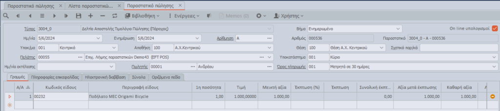 Καταχωρίστε δελτίο αποστολής – τιμολόγιο πώλησης στον πελάτη “Χ” για την πώληση του είδους “A”, συνολικής αξίας 1.240,