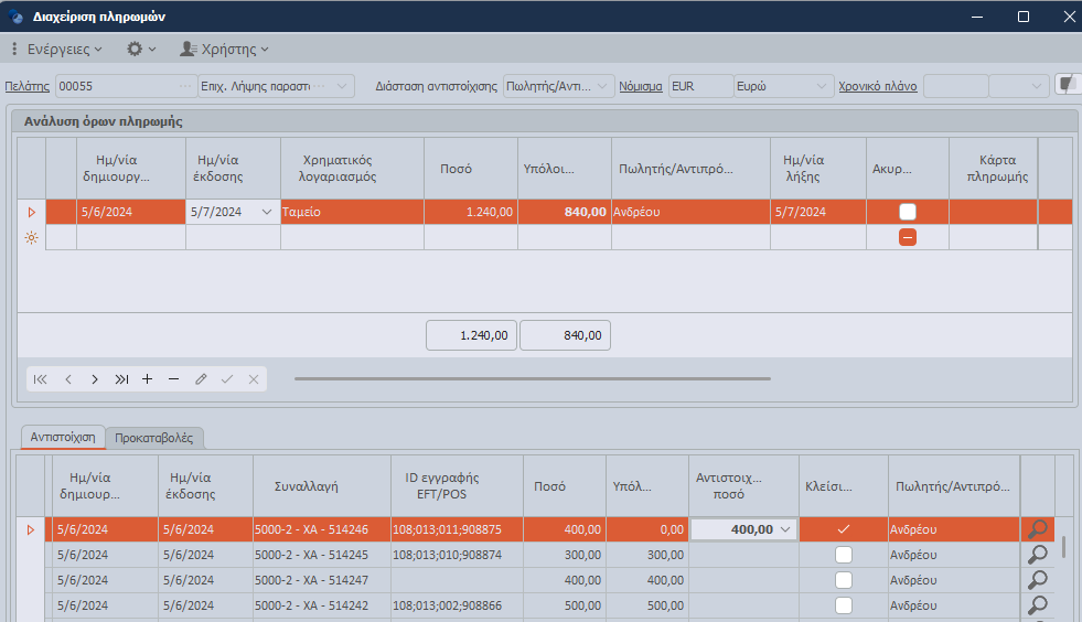 Στην οθόνη “EFT/POS είσπραξη” δηλώστε ποια κίνηση θέλετε να εξοφλήσετε ανοίγει η οθόνη των αντιστοιχίσεων πελάτη με τις ανοιχτές κινήσεις οι οποίες έχουν διαβιβαστεί στον πάροχο αλλά ΔΕΝ έχουν αντιστοιχιστεί