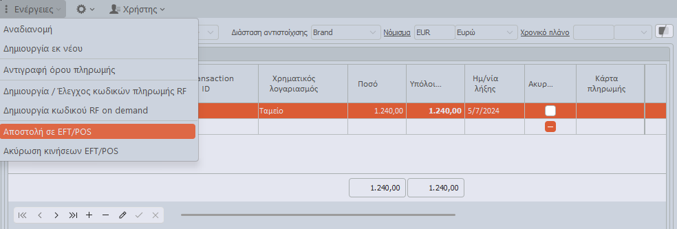 Από το κουμπί ενέργειες επιλέγεται Αποστολή σε EFT/POS