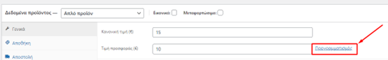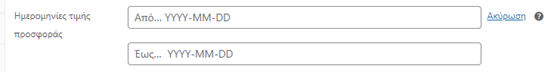 Πατάμε στο κουμπί προγραμματισμός και εμφανίζονται τα παρακάτω πεδία στα οποία ορίζουμε τις ημερομηνίες τις οποίες θέλουμε το συγκεκριμένο προϊόν να είναι σε προσφορά και να ισχύει η τιμή προσφοράς.